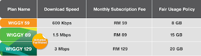 Terdapat 3 plan iaitu Wiggy 59,Wiggy 89 dan Wiggy 129.Nama plan diberi ikut charge dikenakan setiap bulan.Maklumat korang boleh tengok gambar diatas. Apa yang aku suka dengan Wiggy ini adalah korang tengok download speed memang kurang tetapi korang bandingkan quota or fair usage policy dengan mana² broadband. Mana nak dapat byk tu.Pasal quota aku ade cerita kat sini
