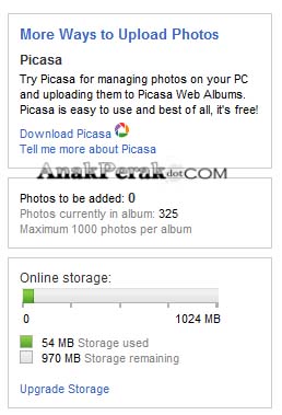 Untuk pengetahuan korang, apa sahaja gambar yang diupload dalam post menggunakan platform Blogger akan disimpan didalam akaun Picasa Web Album. Akaun ini di create secara automatik oleh Google sebab Picasa ini under Google. Sesetengah orang merasa blogger ini upload image unlimited. Teori itu sama sekali salah. Picasa mempunyai quota space iaitu sebanyak 1024MB atau 1GB. Bila sudah sampai limit ini, kena bayar. Jadi korang yang rajin tersalah upload tu baik korang check lik. Delete apa patut.