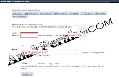 Masukkan host name korang berserta www. Example aku hendak buat blog.anakperak.com aku akan masukkan dalam kotak Host Name itu ‘www.blog‘. Untuk value korang ambil pilihan kedua dan masukkan ghs.google.com