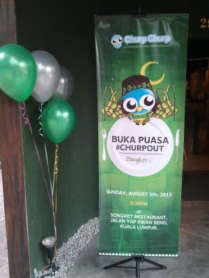 Assalamualaikum. Ahad lalu aku dan wife pergi ke majlis berbuka puasa anjuran ChurpChurp. Inilah jemputan iftar pertama yang aku terima untuk tahun ni. huhu.. Tapi x per, rezeki jangan ditolak. Majlis ini berlangsung di Songket Restaurant, KL. Selain aktiviti makan-makan ada juga aktiviti charity. Setiap orang yang hadir diminta membawa salah satu barangan berikut :