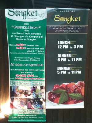Barangan ini untuk diberikan kepada homeless. Apa yang special dekat Songket Restaurant ni? Makanan di Songket Restaurant bertemakan masakan melayu. Antaranya ikan patin masak tempoyak, ikan siakap masam manis, masak lemak udang nanas, rusuk salai berkicap, satey, bubur lambuk dan yang paling special dan laris, kambing panggang.